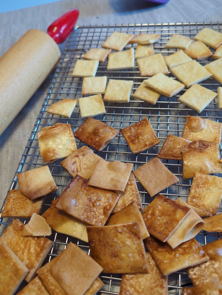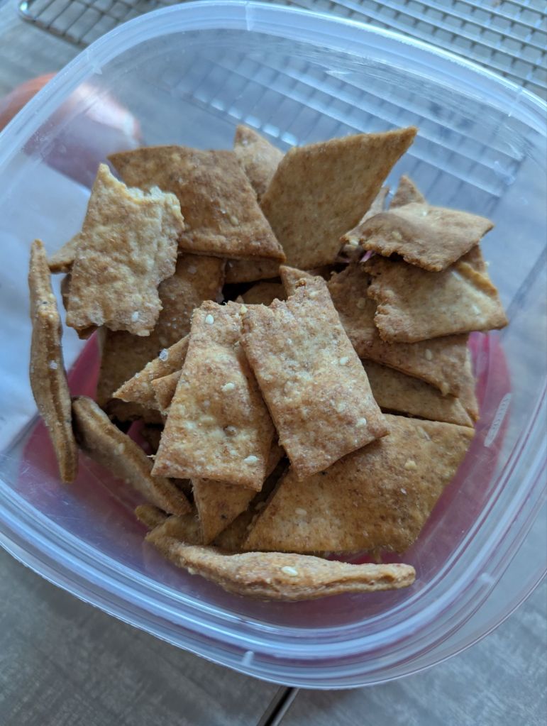 I added in some leftover bagel topping (poppy seeds, sesame seeds, onion and garlic bits that fell off the bagels) and a bit of garlic and onion powder and some extra sesame seeds. The third batch was sans the bagel mix, but still with sesame seeds and they add so much flavour we’ll likely keep doing that. I used my pasta machine to roll the dough out and that worked pretty nicely. I also tried the method of leaving them to toast a bit after turning the oven off which helped to crisp them without overdoing them.